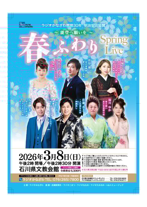 ラジオかなざわ開局30年 明治安田協賛 ~能登へ願いを~ 春ふわり Spring Live 2026年3月8日(日)開催!