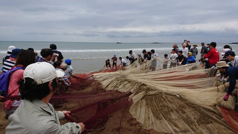 今回は県立鹿島少年自然の家が6月9日に開催した「親子地引き網物語」の模様をお届けします。志賀町大島海岸。駐車場に止めた車から親子が次々と出てきます。今日の目的は地引き網体験。小魚の気配を感じたのでしょうか。上空ではカモメが舞っています。豊かな自然はどんな恵みをもたらしてくれるのでしょうか。クジラが入っていたらどうしよう?そんな楽しい心配も。
